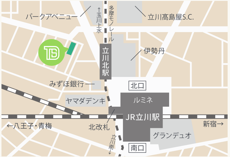 また、JR中央線「立川駅」北口 徒歩3分、多摩都市モノレール線「立川北駅」 徒歩2分と、
